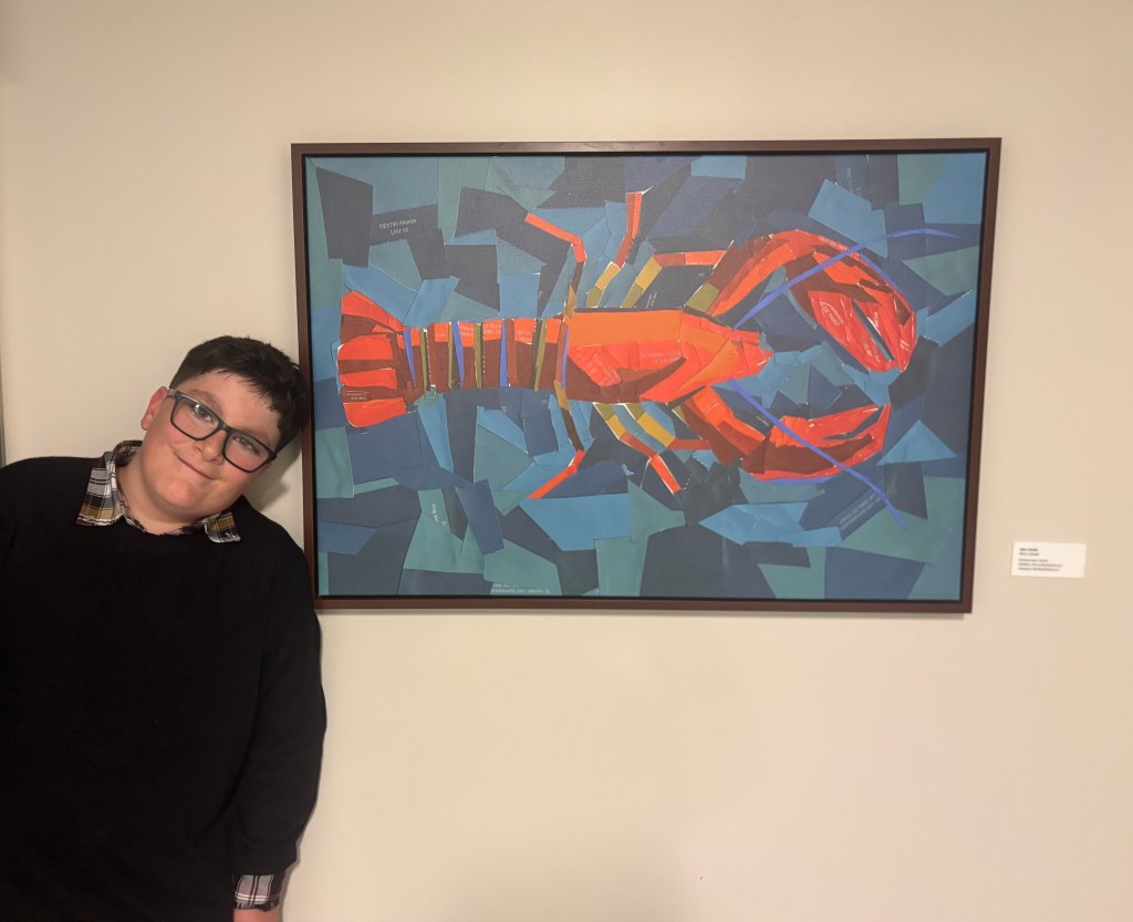 In Betsy Ross Crossing, at the end of the hallway on the first floor, there’s a collage of a lobster swimming in blue. The bright reds and murky turquoises were torn from paint samples and delicately placed to form the recognizable crustacean. It’s the brainchild of Alex Smith, Scamman’s 12-year-old son and the youngest artist with work in the development.