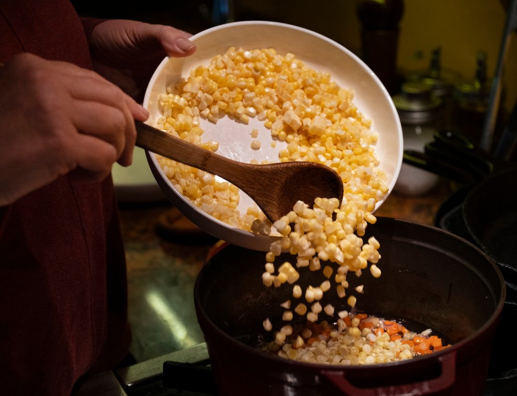 In a second large pot over medium heat, melt the butter. Add the onions, carrots, 1/2 teaspoon salt and 1/4 teaspoon black pepper. Stir and cook until the vegetables soften slightly, 4-5 minutes. Stir in the corn and broth. Increase the heat to medium-high.