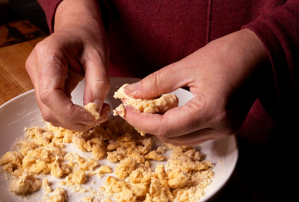 To make the rivels, beat the egg with ¼ teaspoon salt in a bowl. Gradually add the flour. Work the flour into the eggs with your hands, making small chunks of dough.