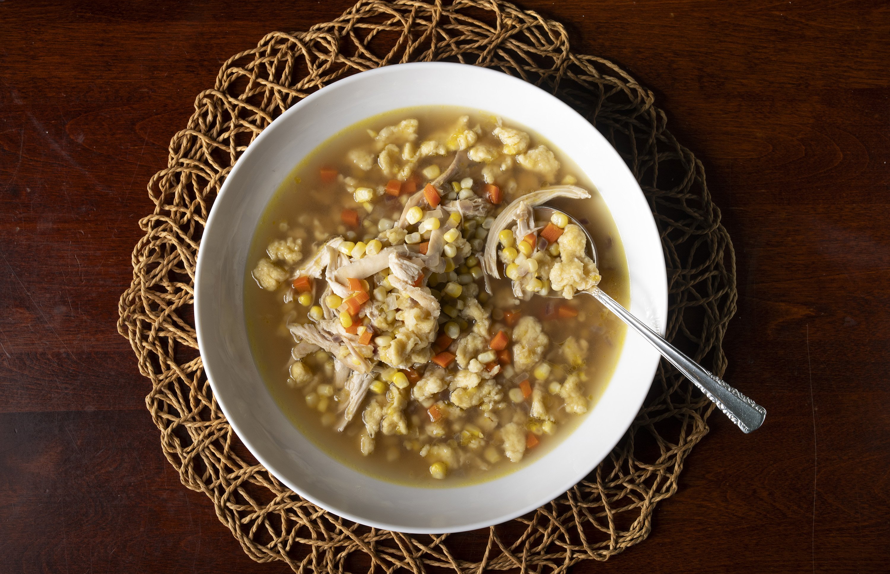 Whether you roast your own or buy a grocery store rotisserie chicken, making broth with the bones is always a good start to this stretch-your-dollar soup. Letting a few spent corn cobs simmer in the chicken broth, while not absolutely required for success, does put a slightly sweet, milky spin on the soup, which has a lot of corn, enough chicken and a hearty amount of quick, easy dumplings known as “rivels.”