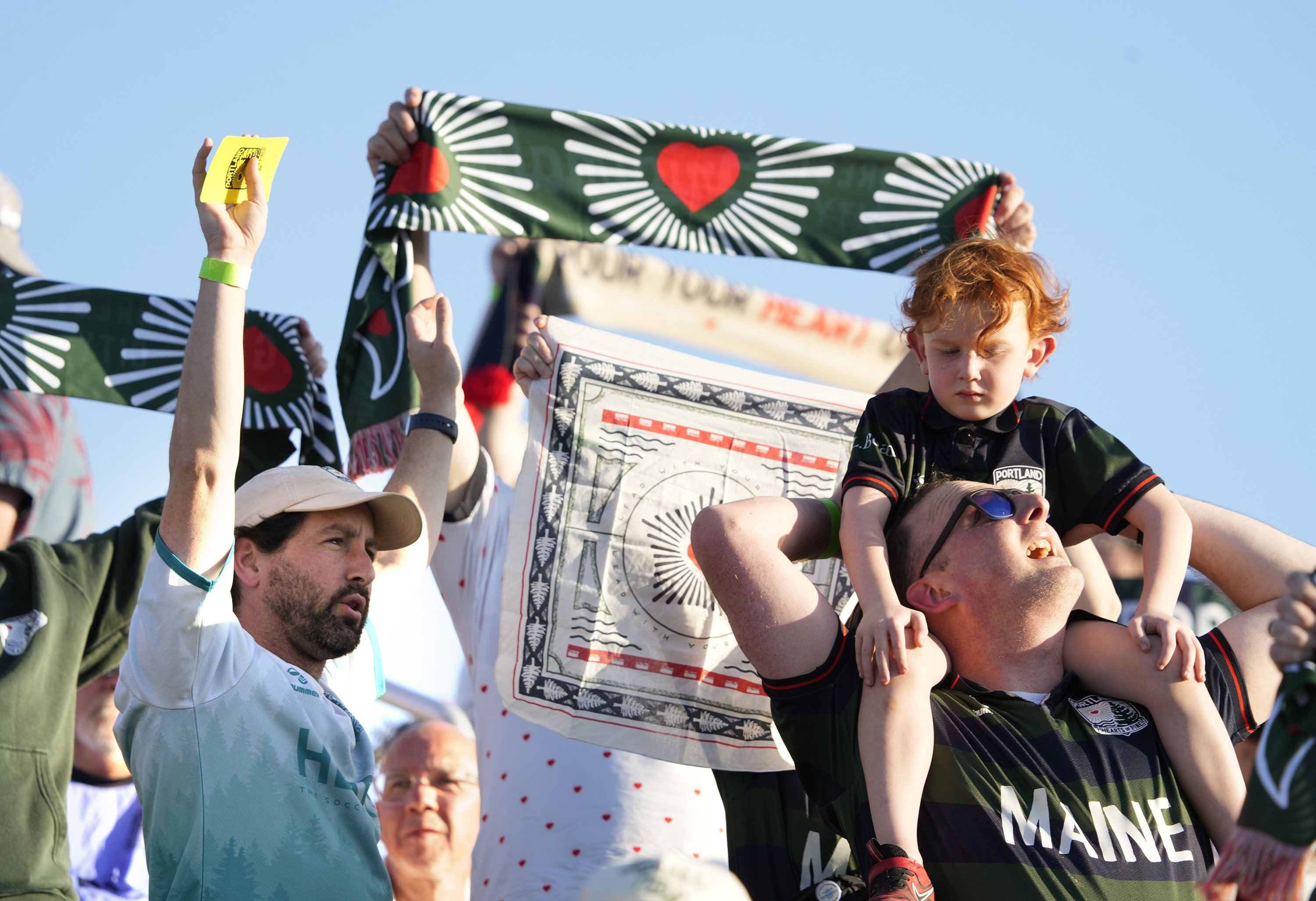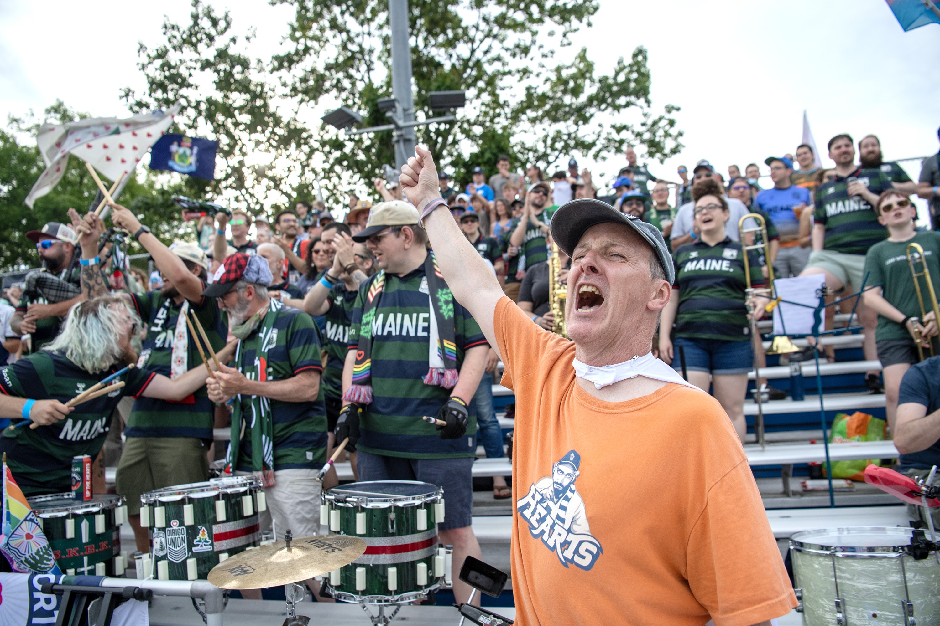 More than an hour before the Hearts’ 5 p.m. kickoff, Donald Thibodeau is already holding court. The supporters section, which makes up 20% of the bleachers on the stadium’s highway side, will soon throb with noise. Members of the Dirigo Union supporters group unfurl banners between sips of beer, pull trumpets out of cases and grab ear plugs in preparation for the coming cacophony.