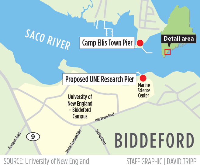 The pier project has been controversial for the past year, with residents pushing for a different location than the one proposed, which is located on the Saco River adjacent to the Arthur P. Girard Marine Science Center on the UNE campus.