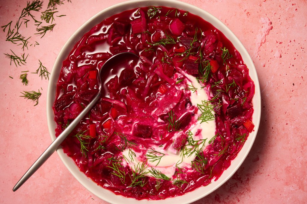 Tangy sauerkraut, a squeeze of lemon and a cool dollop of sour cream balance the sweetness of the beets in this hot vegetarian borshch. Packed with hearty root vegetables and cabbage, and flavored with fresh dill, it tastes like ultimate comfort food. The soup’s depth of flavor comes from the sauerkraut and a few hours of simmering, making it a terrific weekend project and make-ahead dish for busy weeknights.