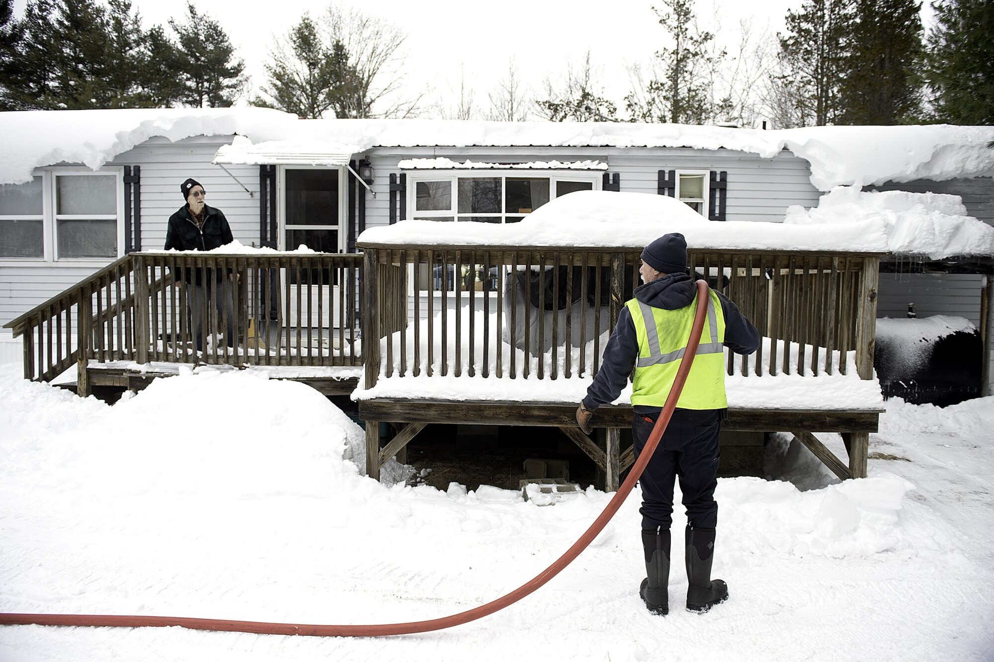 Dave Levesque of Murray-Heutz Oil and Propane, right, chats with Phil Ring while delivering heating oil to Ring’s home in Auburn on Jan. 25, 2023. (Daryn Slover/Staff Photographer)