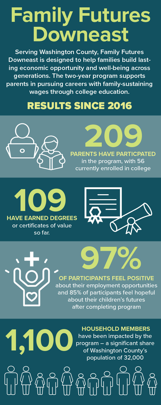 Informed by the perspectives of families in Washington County, Family Futures Downeast is a two-generation program that supports parents and their children simultaneously. Serving a region with some of the state’s highest poverty rates, the program has helped families build lasting economic opportunity and well-being across generations.
