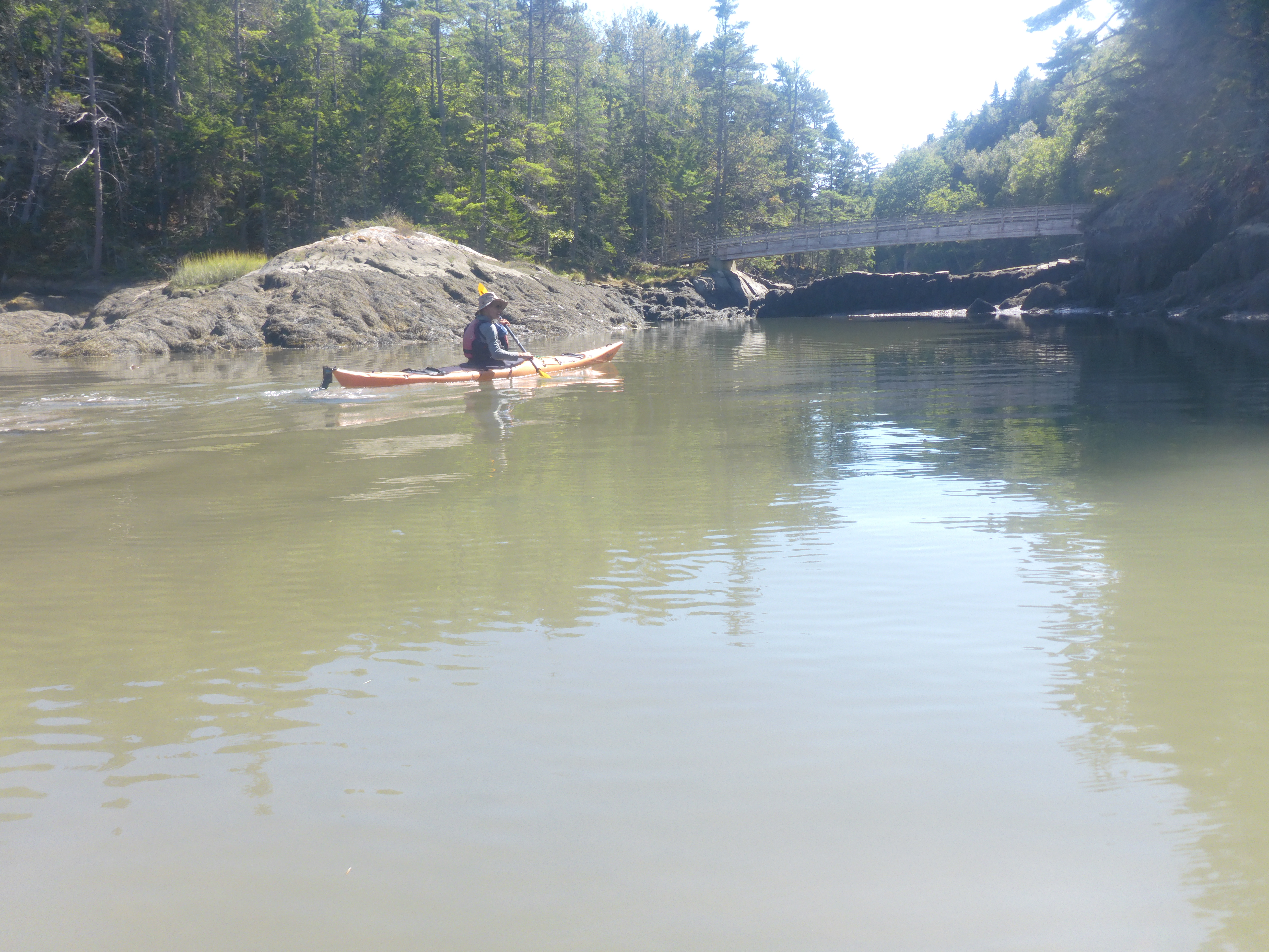 From there, we angled east back into the passage, followed high cliffs along the right shore and entered Ice House Cove on the right. Since the tide was still relatively low, the remains of a 19th-century dam that once formed a freshwater pond used for ice harvesting were exposed. A pedestrian bridge that connects trails in the Ovens Mouth Nature Preserve crosses over the cove just south. We stopped on rocks next to the dam for a lunch break. Afterwards, we continued east until the passage ends where it joins Cross River tidal basin.
