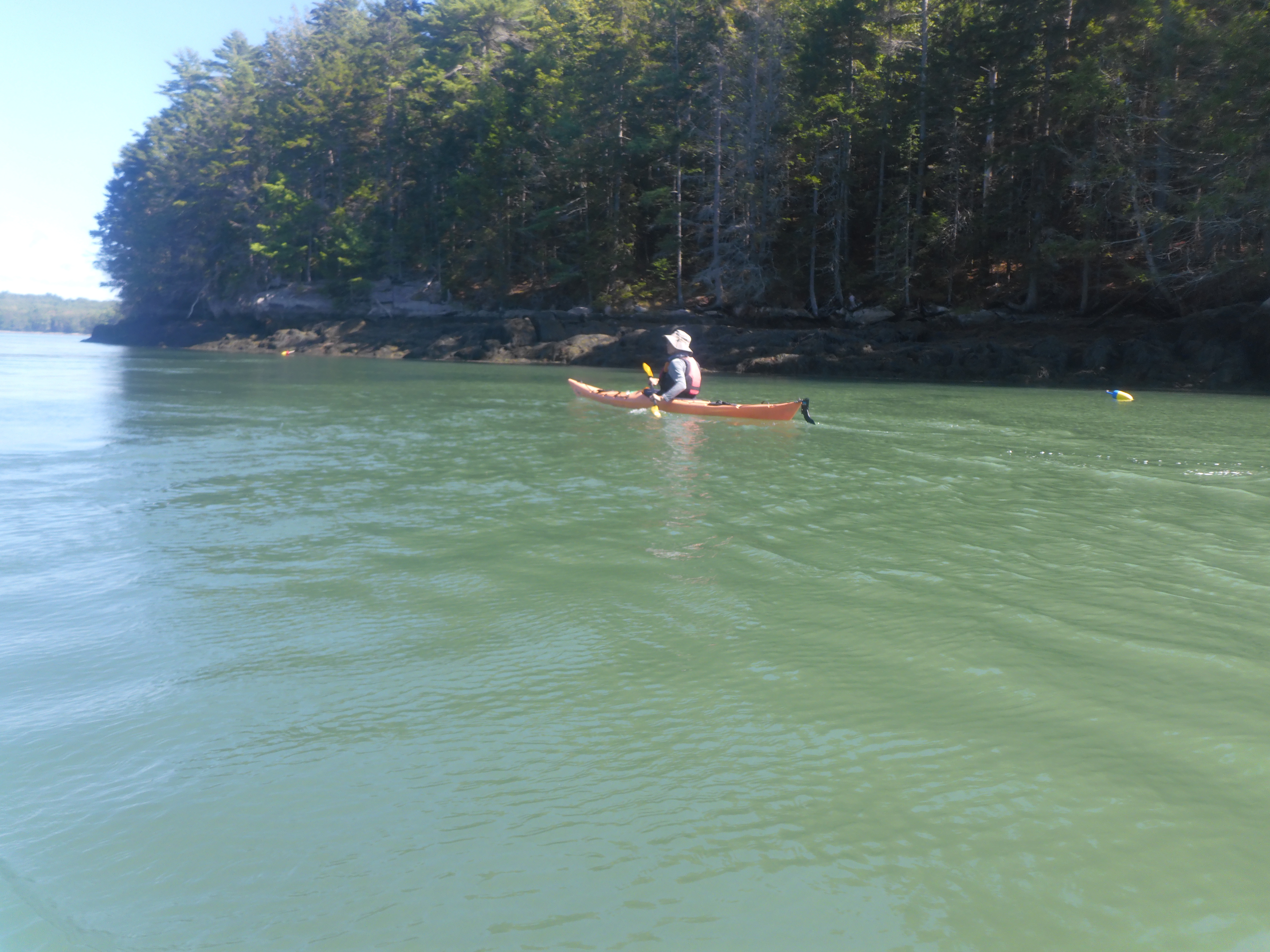Although the entrance to Ovens Mouth Passage was not visible, our marine chart indicated we should travel northeasterly to locate the narrow opening. Persisting past tiny Gooseberry Island, we turned east around the northwestern end of the Boothbay mainland and entered Ovens Mouth, where turbulent tidal currents were pouring into the narrow twisting channel. We carefully maneuvered our kayaks through confusing rip currents and caught an eddy in a tidal cove on the right.
