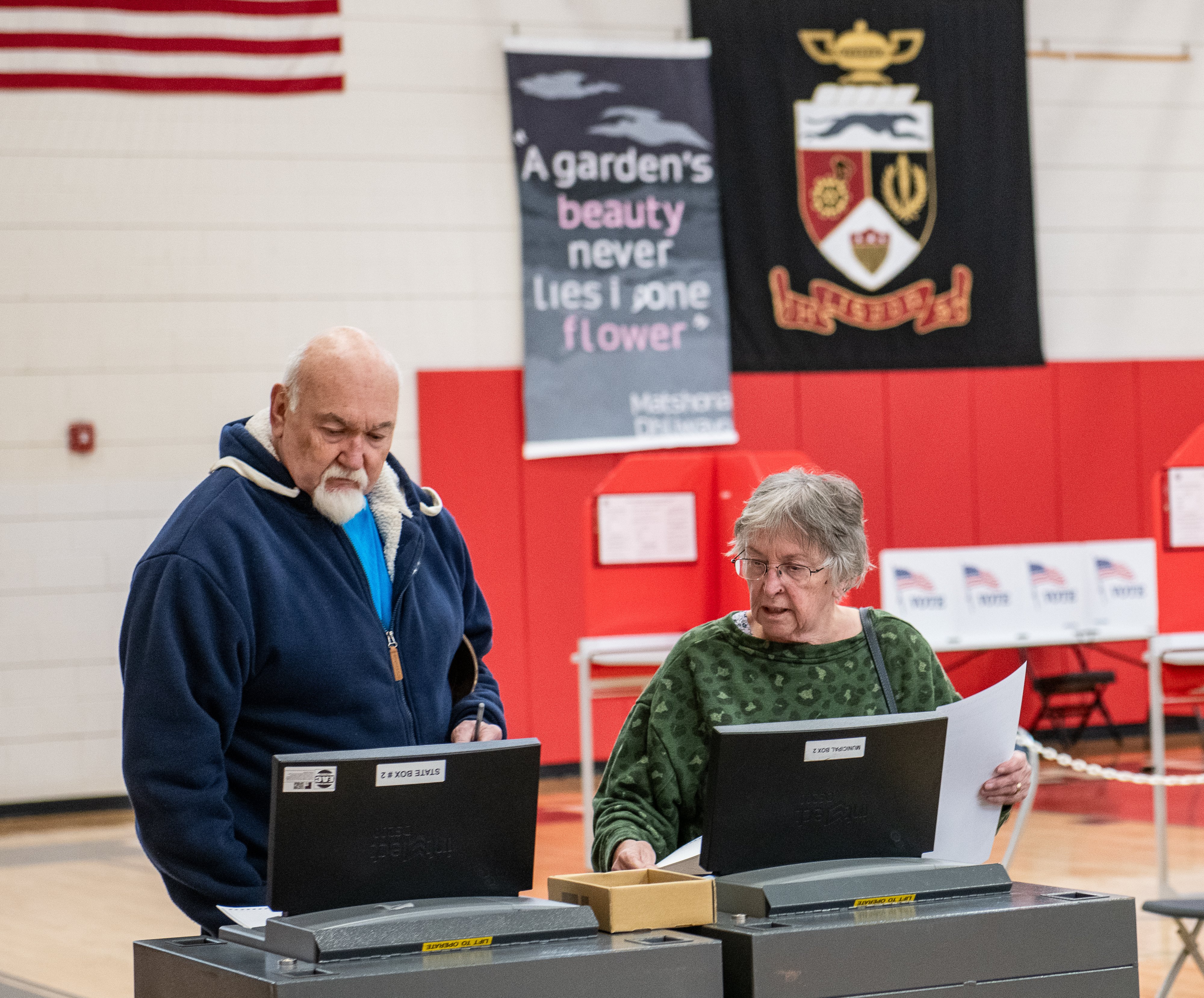 Wayne and Phyllis Gorey of Lisbon cast their ballots Tuesday in the gym at Lisbon High School. “We are not really passionate about any of the issues, we are just doing our civic duty,” Wayne said. For a full slate of election results, go to sunjournal.com (Russ Dillingham/Staff Photographer)