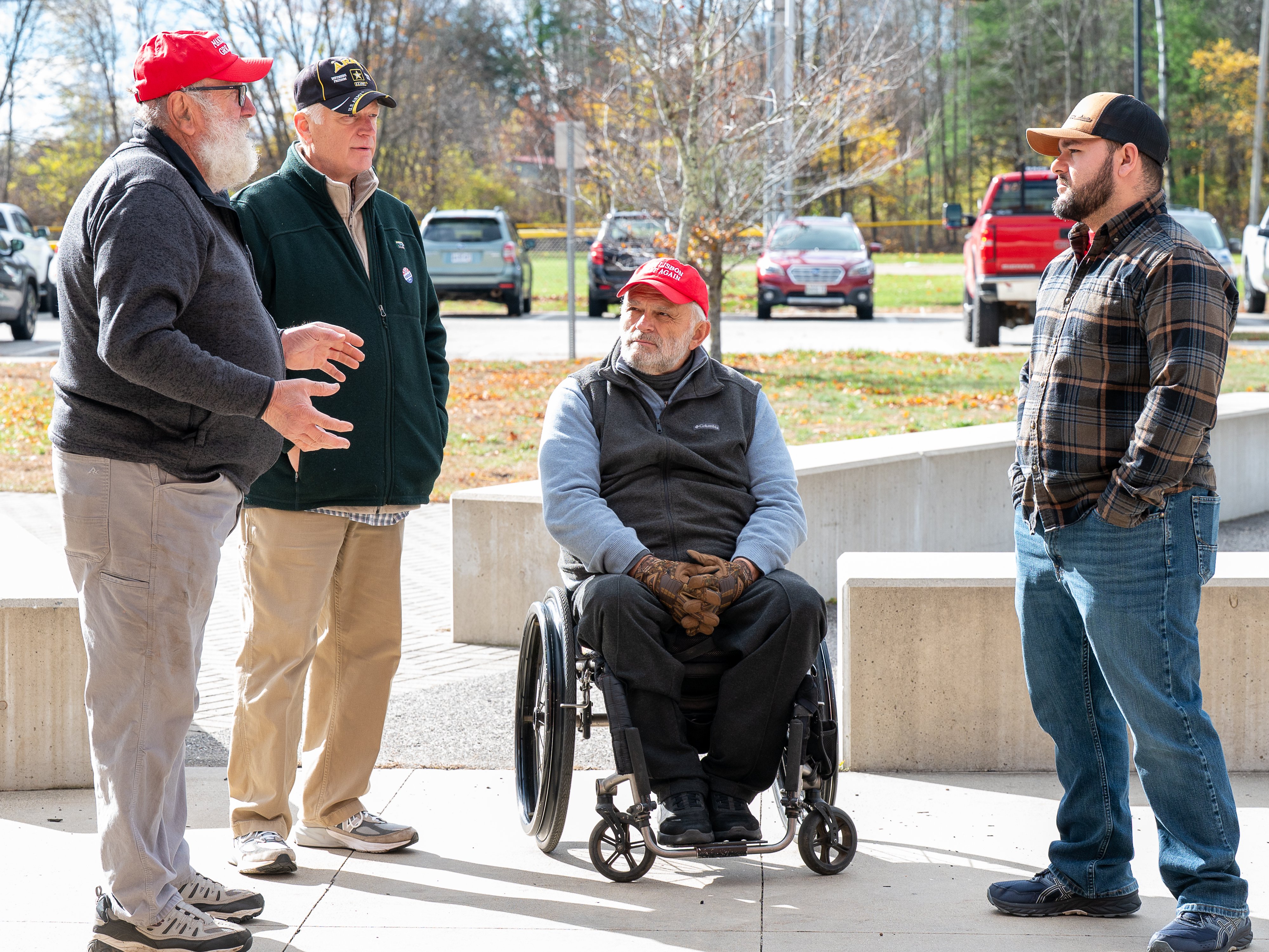 Lisbon Town Council candidates, from left, Roger Bickford, Greg Garnett, Dale Crafts and Joe Costa talk Tuesday morning outside the Lisbon High School gym where they were greeting residents arriving to vote. Along with Eric Metivier, Bickford, Crafts and Garnett ran on the same platform, with the latter three winning seats on the council Tuesday. (Russ Dillingham/Staff Photographer)