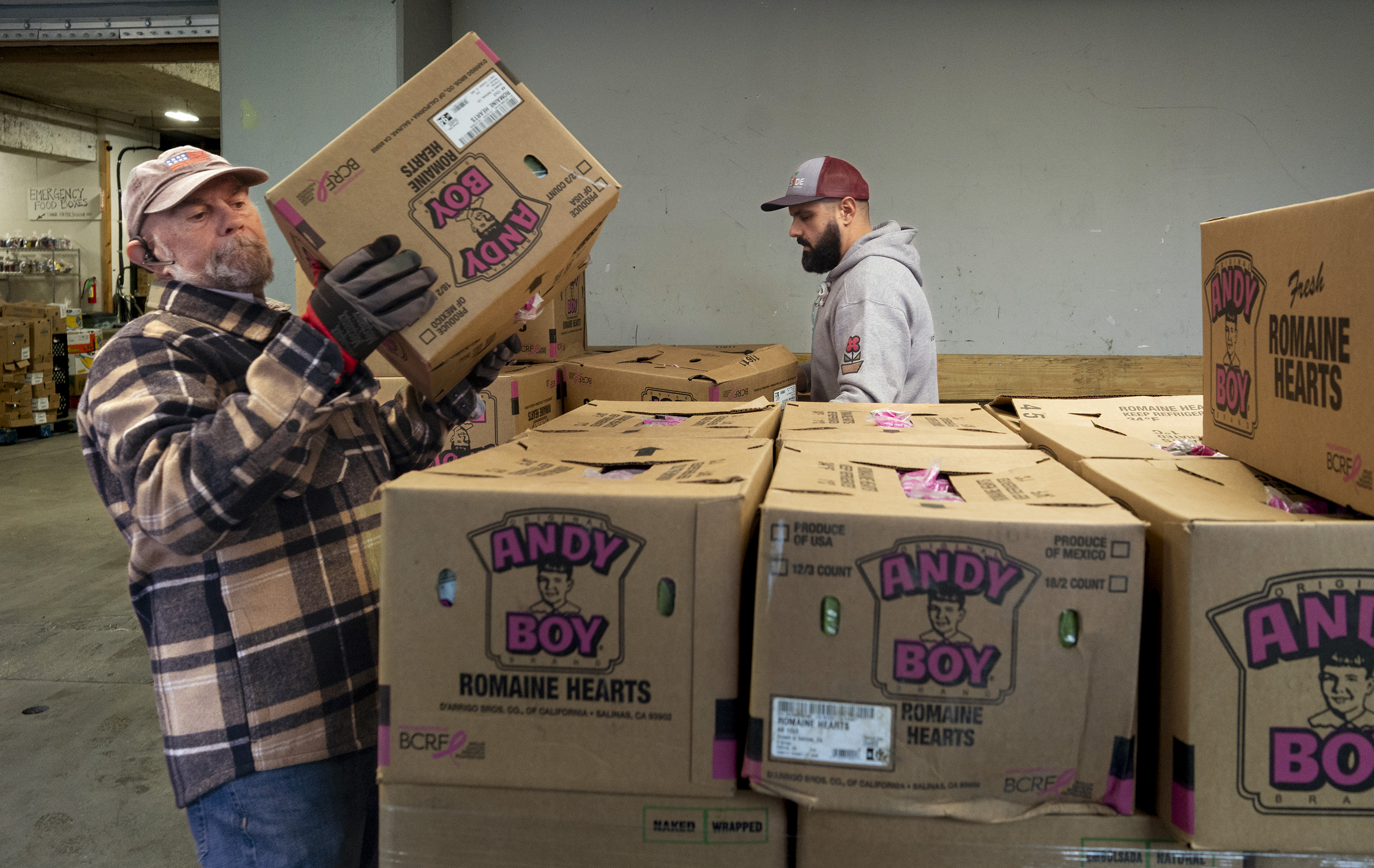 Terry Swett of the Harrison Food Bank, left, and Marcus Boucher of Wayside Food Programs load boxes of lettuce onto a pallet in the loading bay of Wayside Food Programs in Portland on Monday. (Gregory Rec/Staff Photographer)
