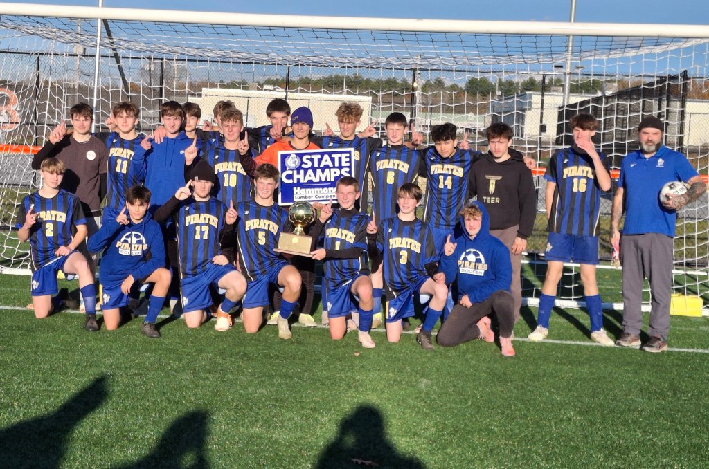Piscataquis poses with the Gold Ball after beating Telstar 2-1 in the 8-person boys soccer state championship game on Saturday in Brewer. (Nathan Fournier/Staff Photographer)