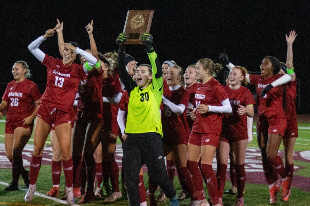 The Bangor girls soccer team celebrates its third-straight Class A North regional title after defeating Camden Hills, 4-1, on Tuesday. (Cooper Sullivan/Staff Photographer)