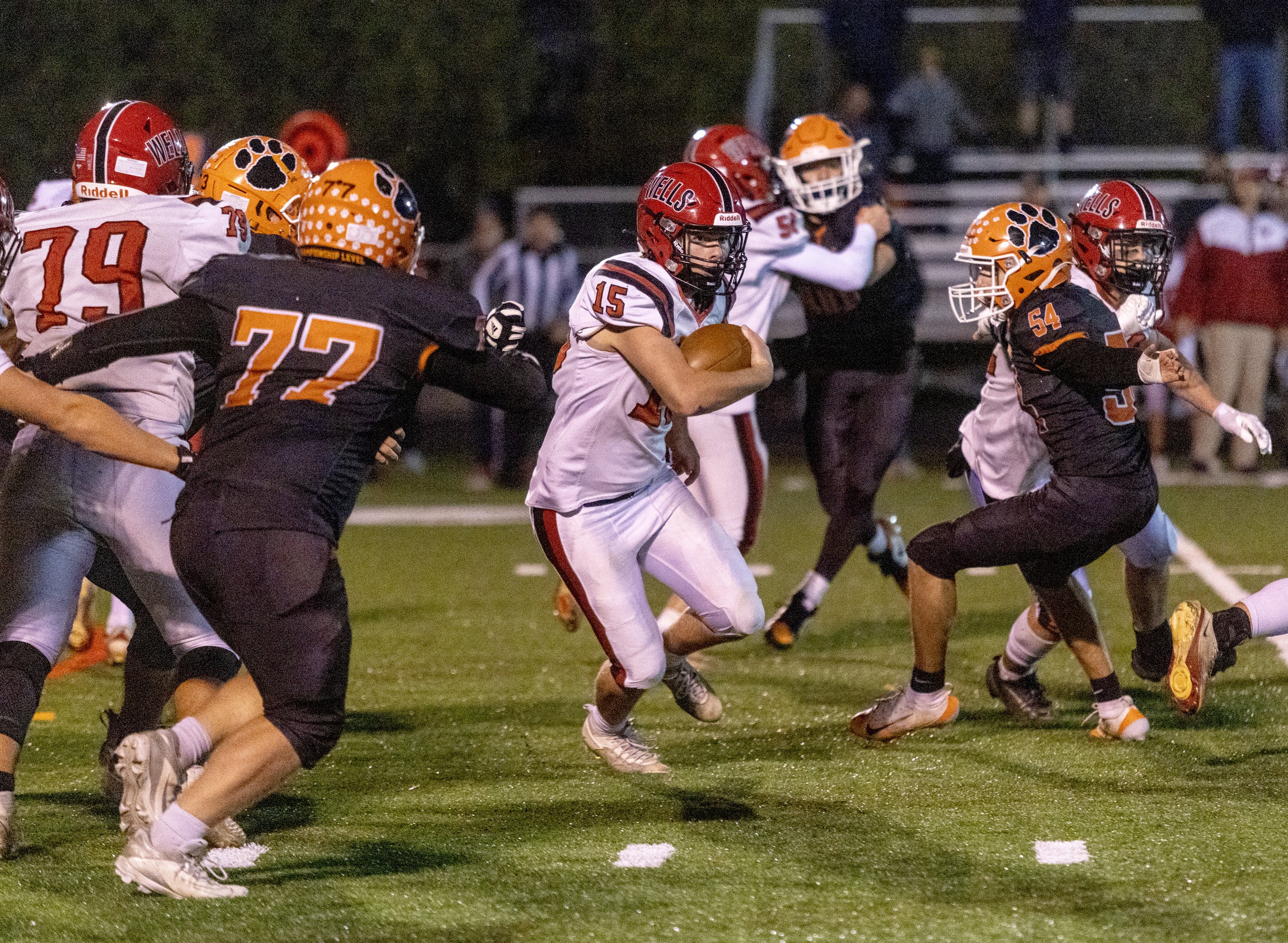Oxford Hills’ Dylan Truman breaks into the secondary against Massabesic. (Brewster Burns photo)