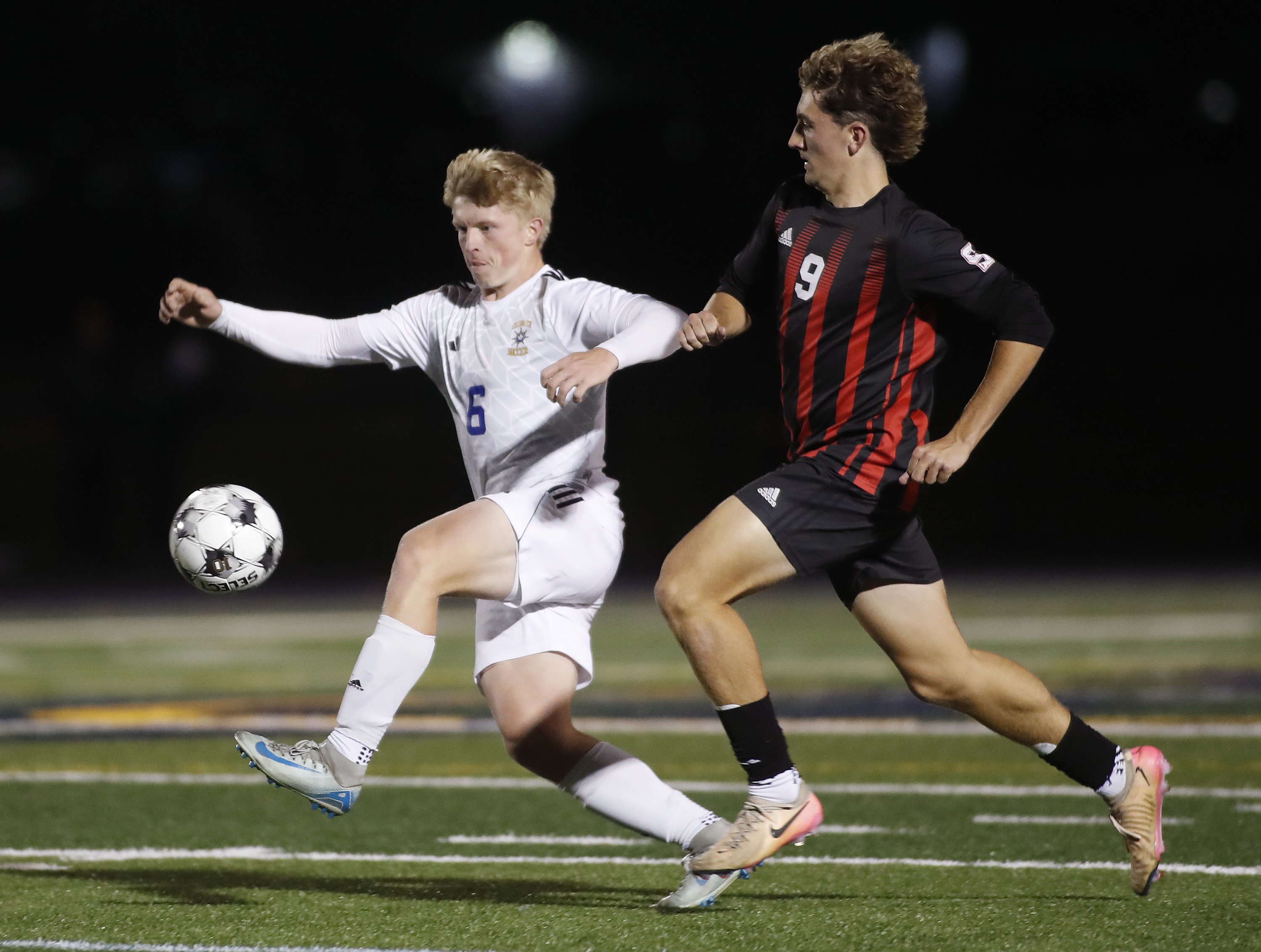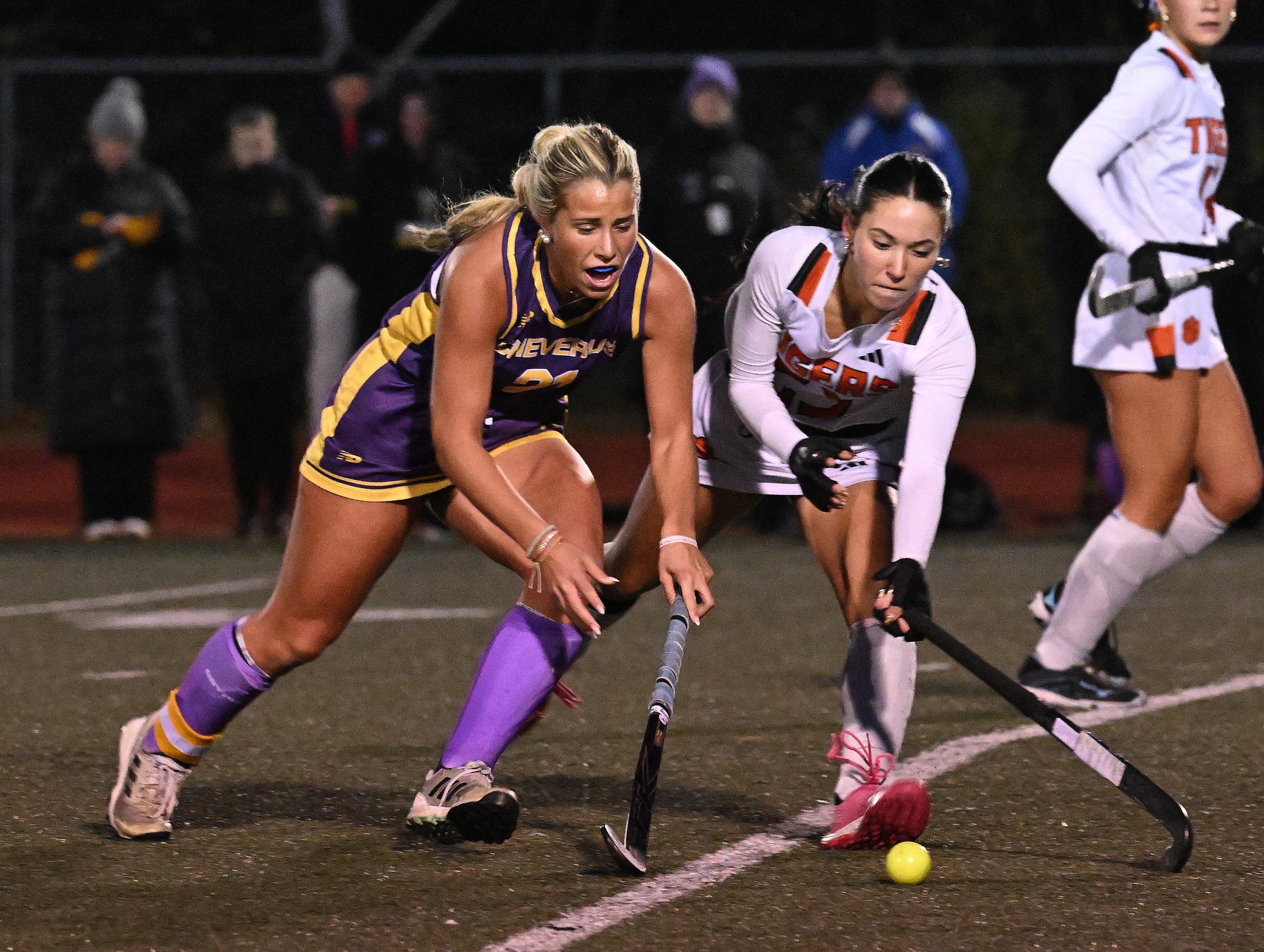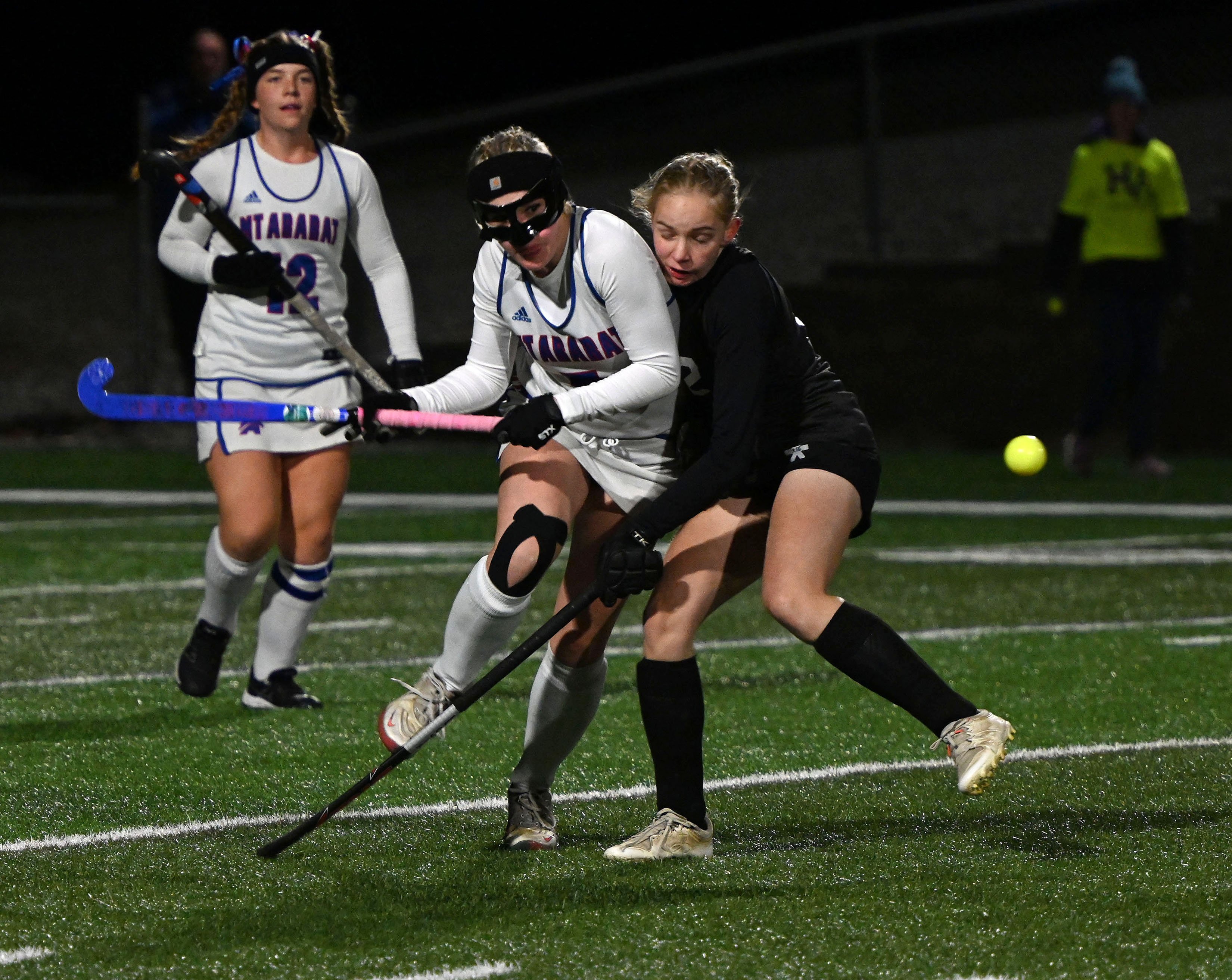 Greely defenders and goalie Landon Dominski watch as the ball skims past Yarmouth’s Zacarias Binda in the first overtime Thursday. Binda eventually scored in the second overtime, giving Yarmouth a 2-1 victory. (Derek Davis/Staff Photographer)Joey Pompeo of Cheverus battles for the ball with Biddeford’s Mia Mariello. Cheverus beat Biddeford 3-2 in overtime to win the Class A South field hockey final on Thursday in Yarmouth. (Shawn Patrick Ouellette/Staff Photographer)Freeport senior captain Lizalyn Boudreau dribbles between Yarmouth’s Celia Zinman, left, and Maya Nasveschuk. The Falcons beat Yarmouth, 1-0, to win the Class B South field hockey title on Thursday in Yarmouth. (Daryn Slover/Staff Photographer)Mt. Ararat’s Abi Tidwell, center, and Skowhegan’s Lillian Smith battle for the ball. Skowhegan beat Mt. Ararat, 3-0, in the Class A North field hockey final on Thursday in Hampden. (Rich Abrahamson/Staff Photographer)Telstar goalie Adam Stephenson jumps to make a save during the eight-person boys soccer South regional final against Pine Tree Academy on Thursday in Gardiner. Stephenson didn’t allow a goal as the Rebels beat the Breakers 1-0 in double overtime. (Libby Kamrowski Kenny/Staff Photographer)