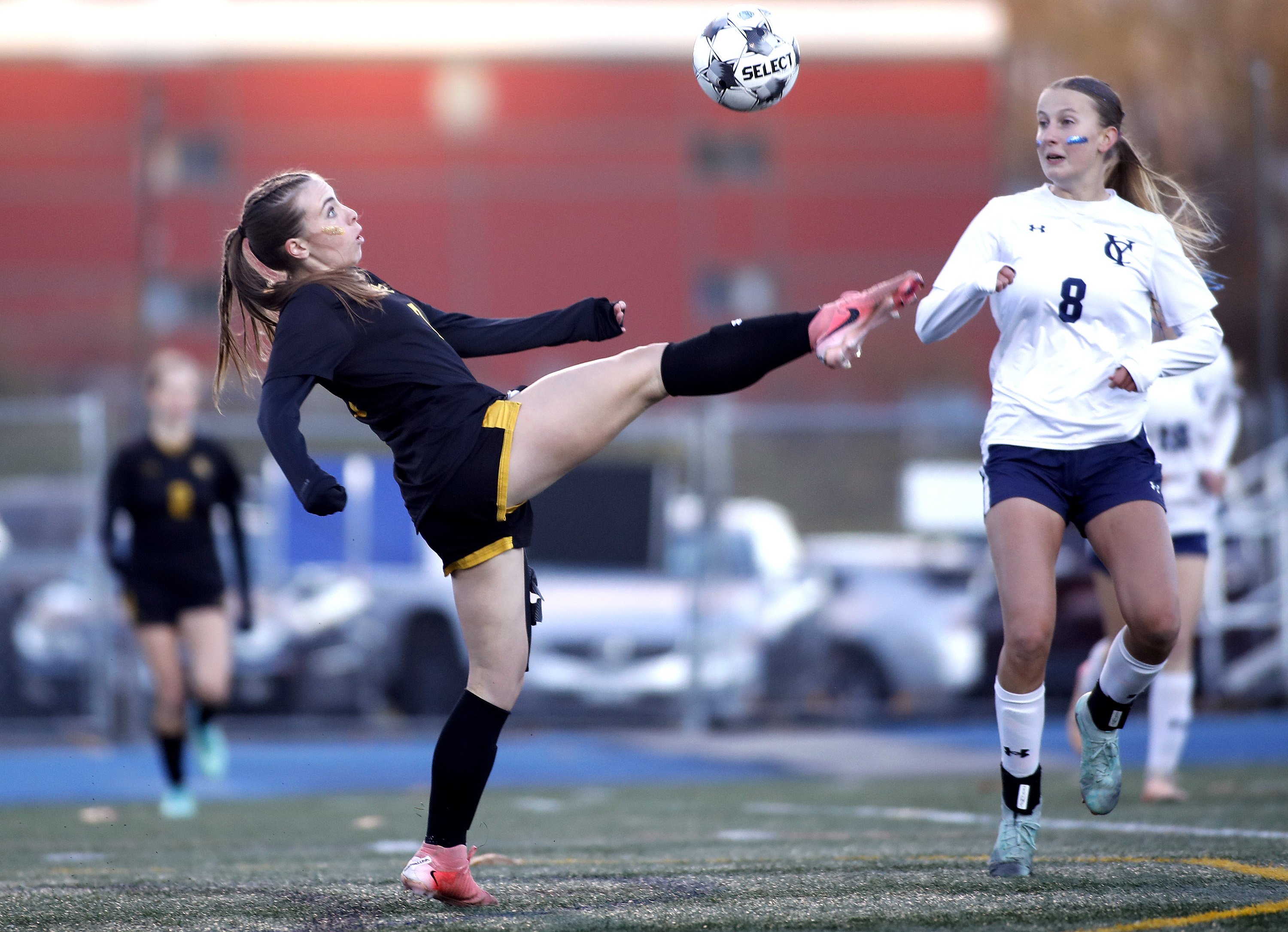 Adelle Pease of Spruce Mountain tries to control the ball as Ella Hutchinson of Foxcroft Academy makes a play on it. (Gregory Rec/Staff Photographer)