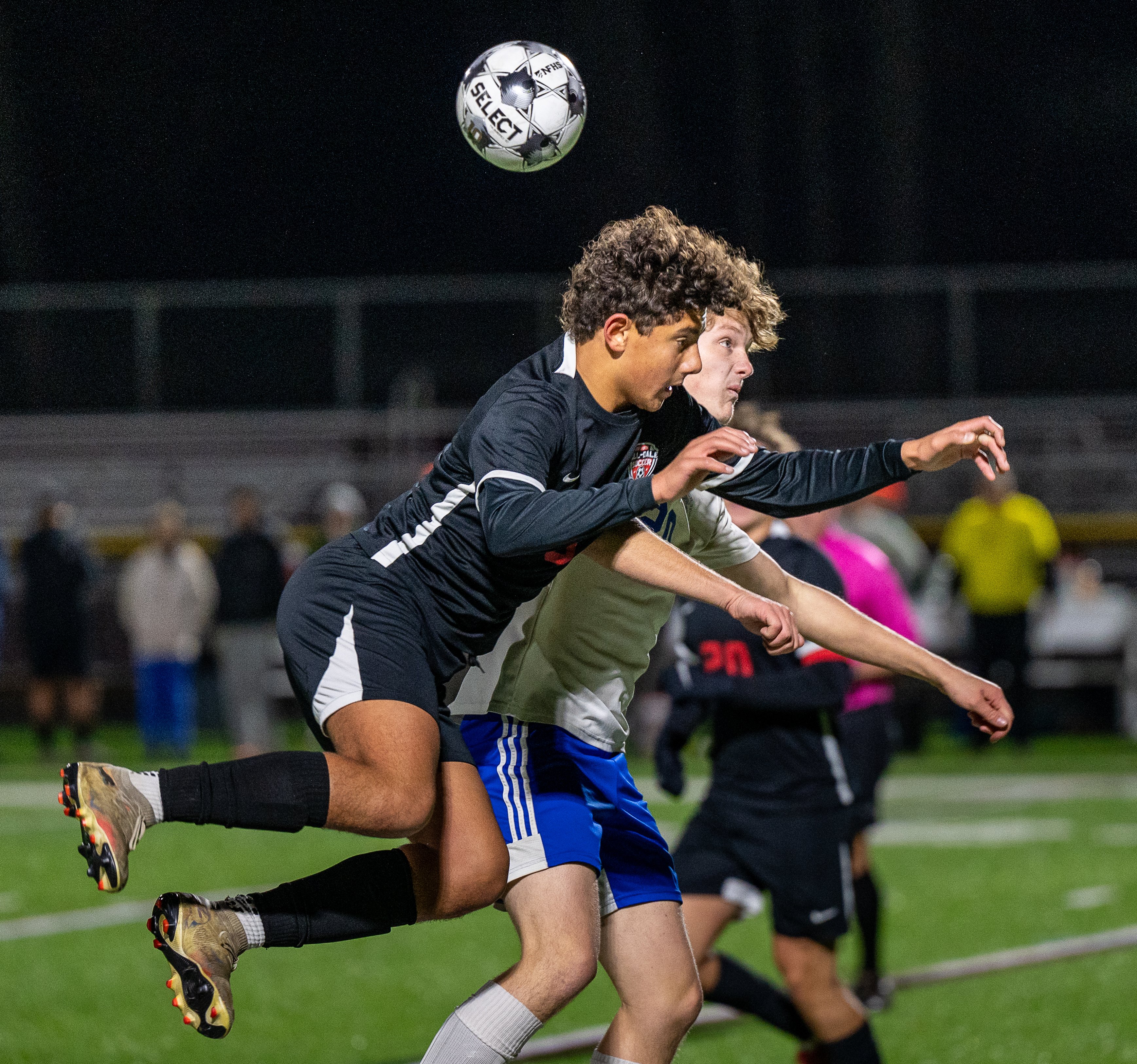 Orono's Lucas Heibeler heads the ball under pressure from Hall-Dale's Owen Free. (Libby Kamrowski Kenny/Staff Photographer)