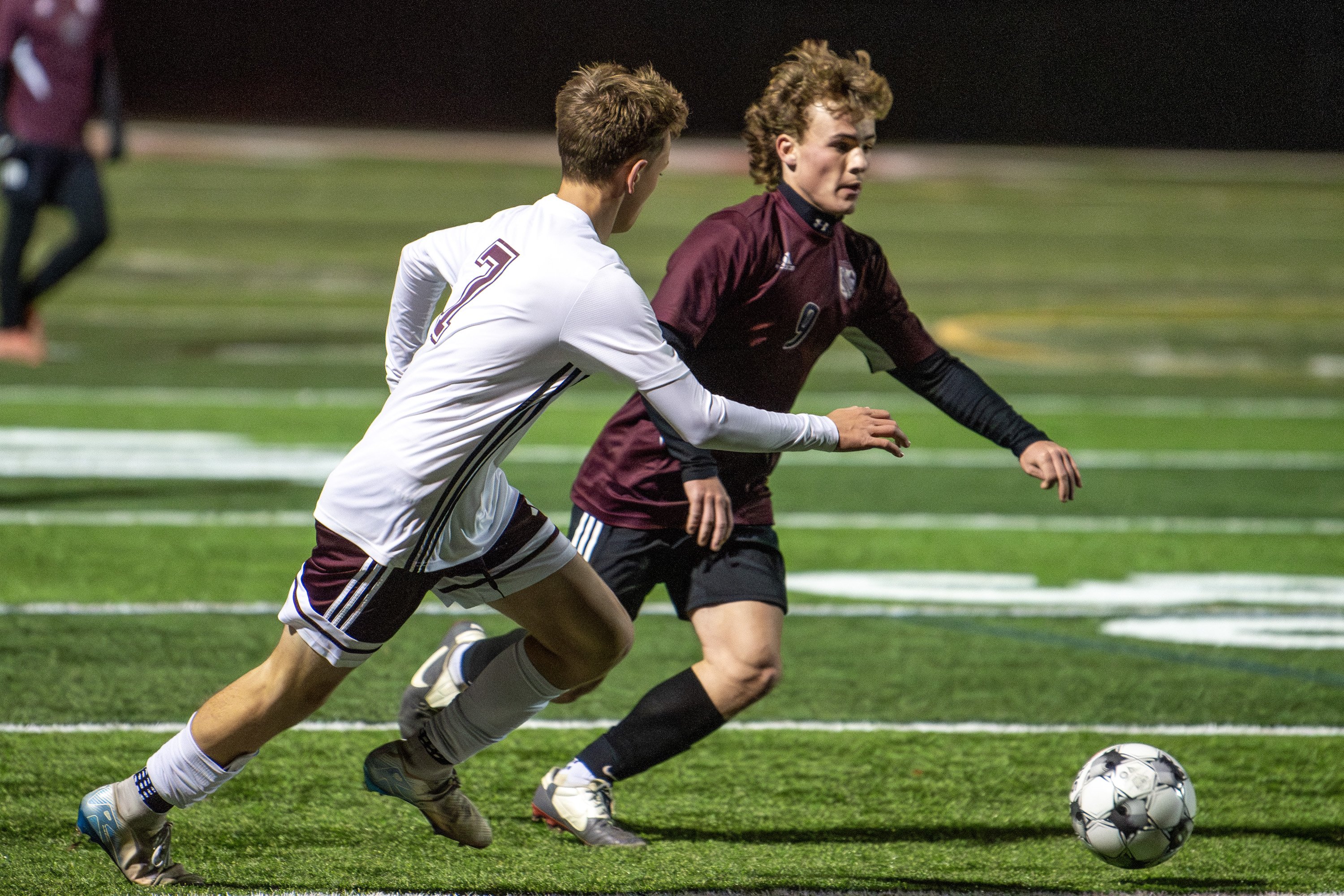 Monmouth Academy’s Rory Foyt and Fort Fairfield’s Ethan Walsh battle for the ball during the Class D final. (Anna Chadwick/Staff Photographer)