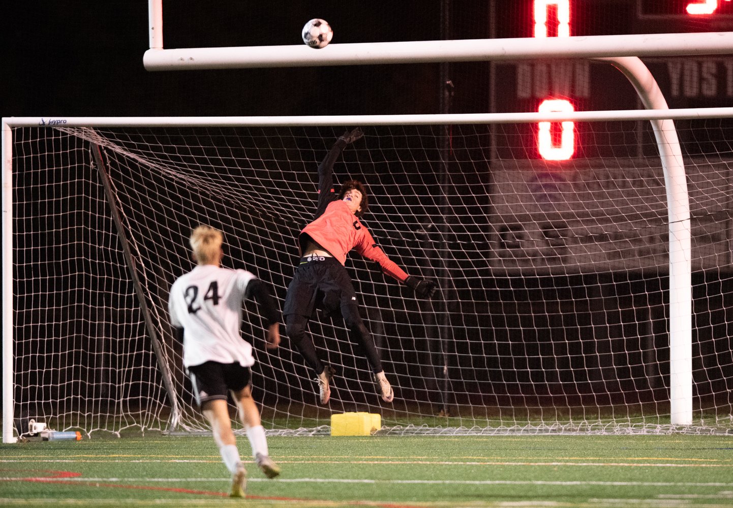 Camden Hills senior keeper Brian Leonard makes a save against Brunswick junior forward Oliver Gorchoff in the Class A North final. (Cooper Sullivan/Staff Photographer)