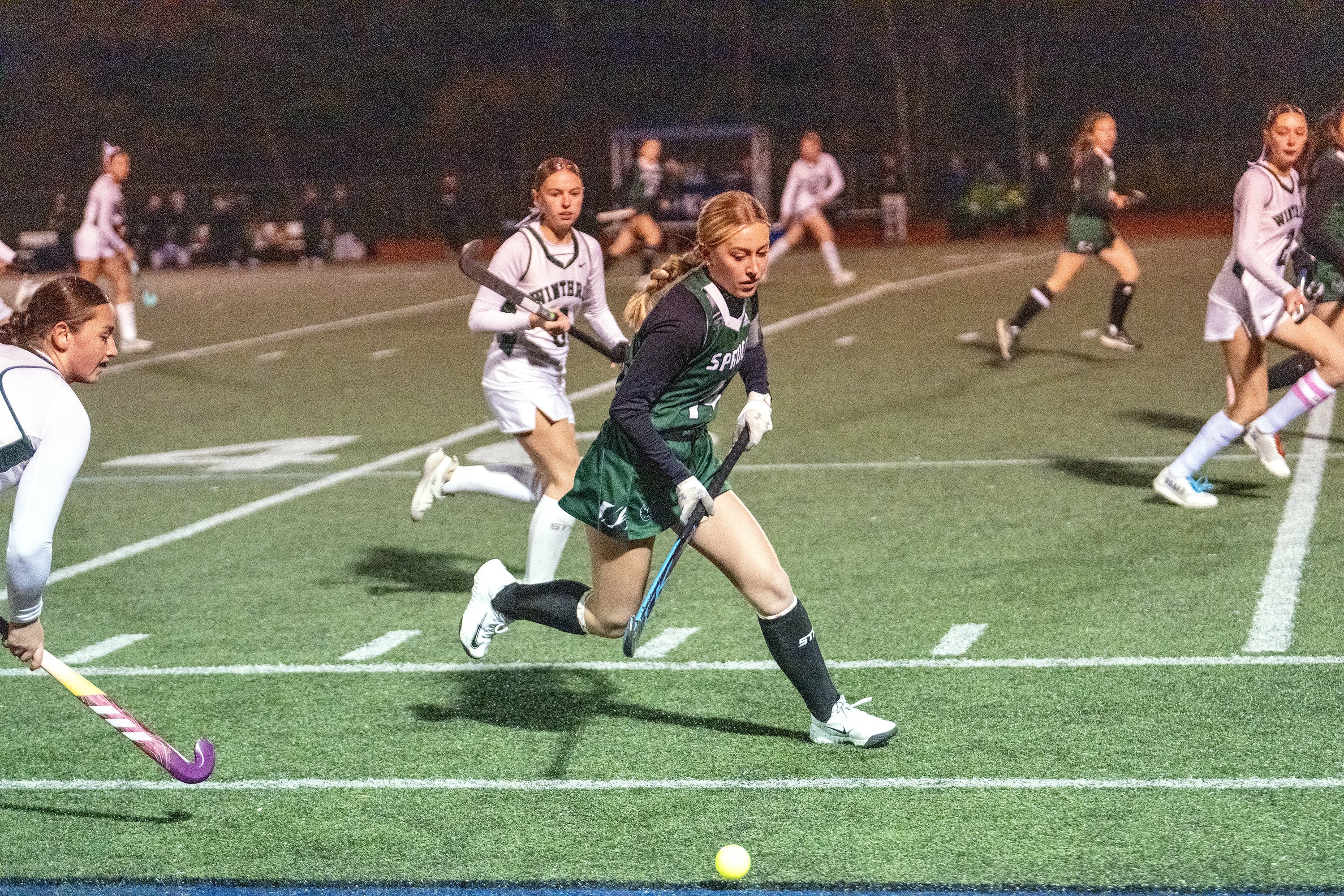 Joey Pompeo of Cheverus moves the ball down the field during the Class A field hockey state championship game against Skowhegan at Lewiston High School on Saturday. (Gregory Rec/Staff Photographer)