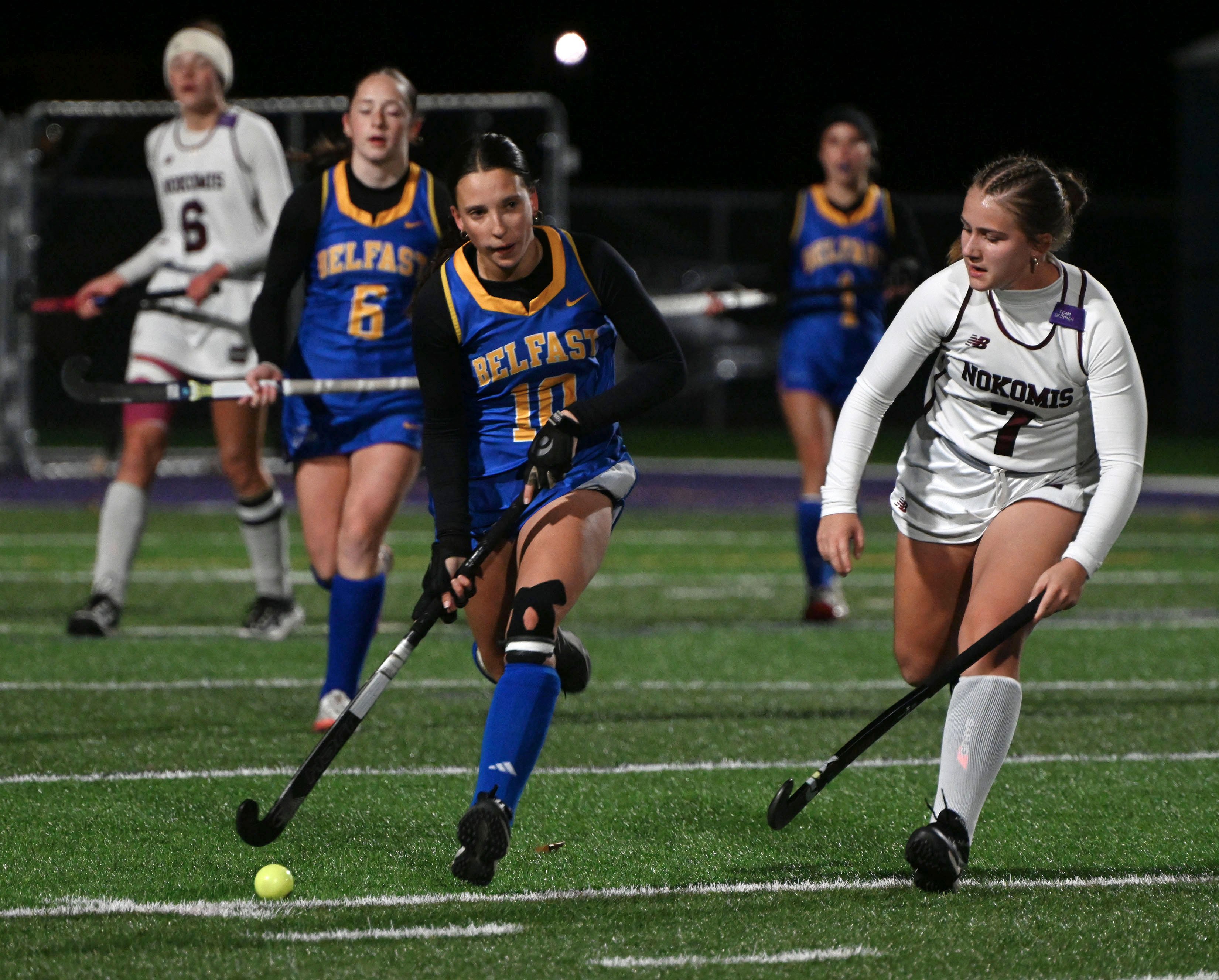 The Oceanside boys soccer team celebrates with the Class B North championship plaque after beating John Bapst 2-1 in overtime on Thursday night at Cameron Stadium in Bangor. It’s Oceanside’s first regional title. (Dave Dyer/Staff Reporter)Belfast’s Allison Friel, pushes the ball downfield against Delanie Randlett of Nokomis. (Rich Abrahamson/Staff Photographer)