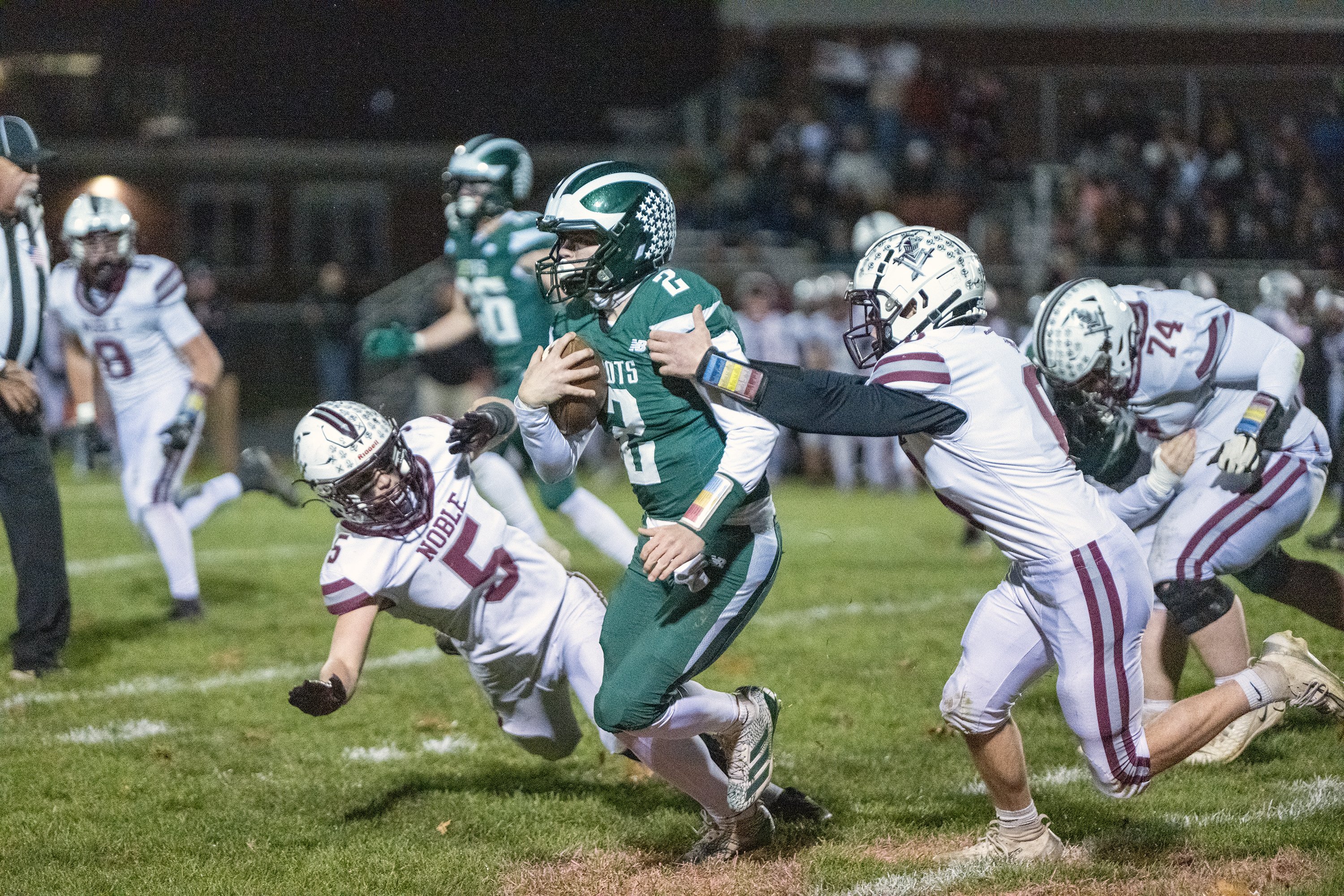 Colin Moran of Bonny Eagle is brought down by Jackson Mulligan, left, and Wyatt Chandler of Noble during their Class A South semifinal Friday in Standish. (Daryn Slover/Staff Photographer)