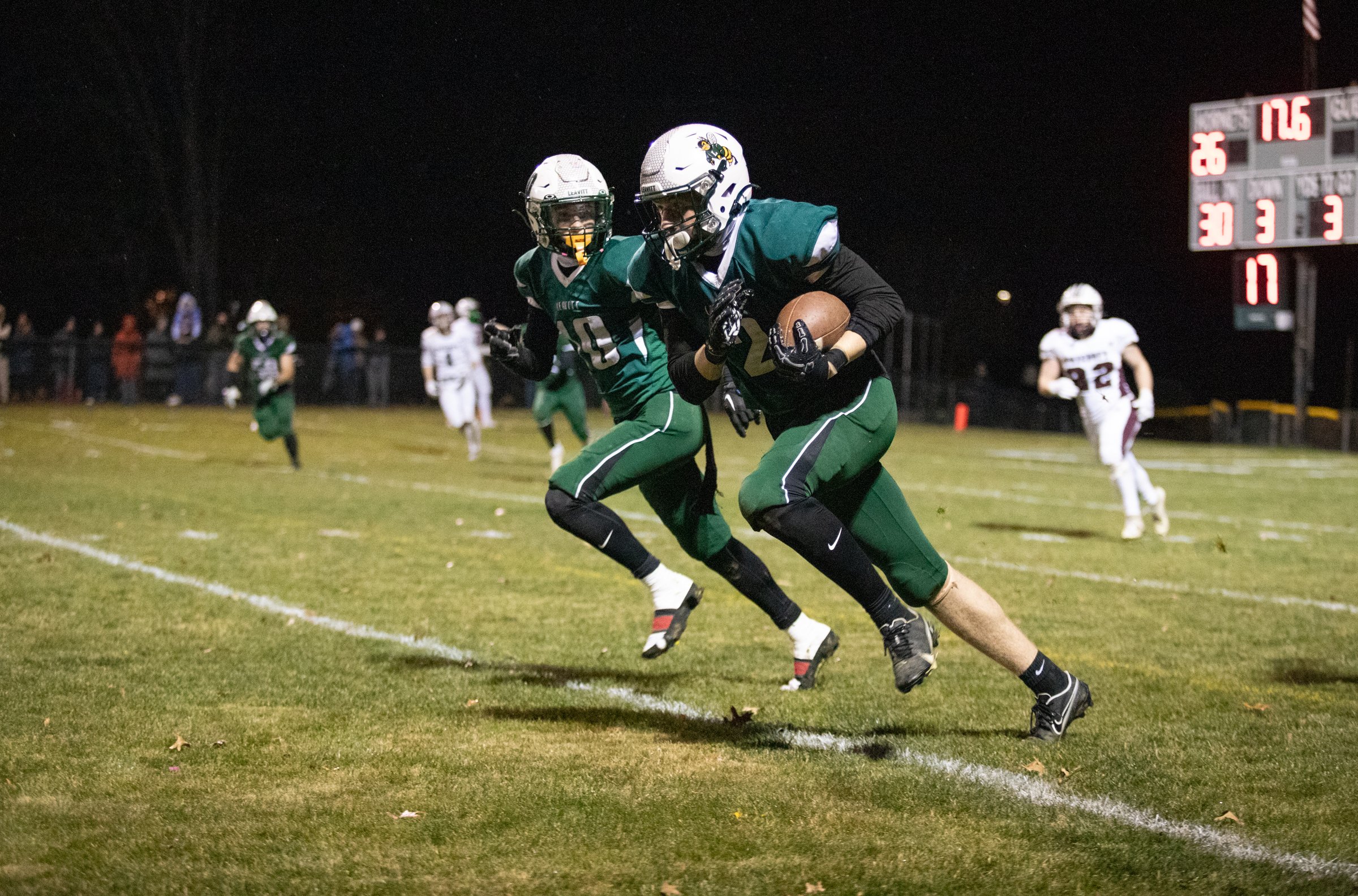 Leavitt’s Brody Poland, left, runs alongside Cooper Morin as Morin returns a kickoff during Friday’s Class C quarterfinal against Foxcroft on Friday in Turner. Leavitt won 34-3. (Libby Kamrowski Kenny/Staff Photographer)