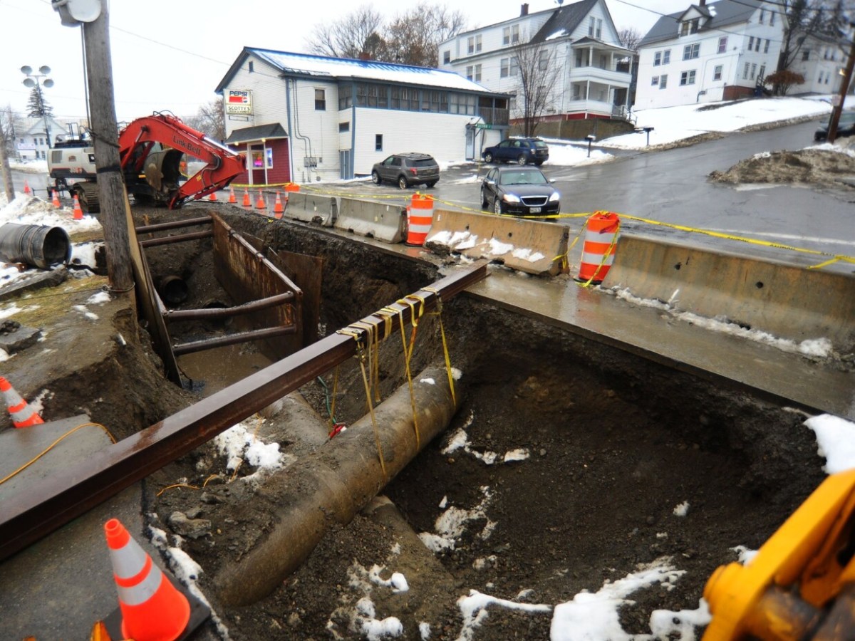 Crews on Thursday installed the final length of a 30-inch force sewer pipe on Water Street as part of a two-week project to fix a broken pipe that dumped 34 million gallons of sewage into the Kennebec River.