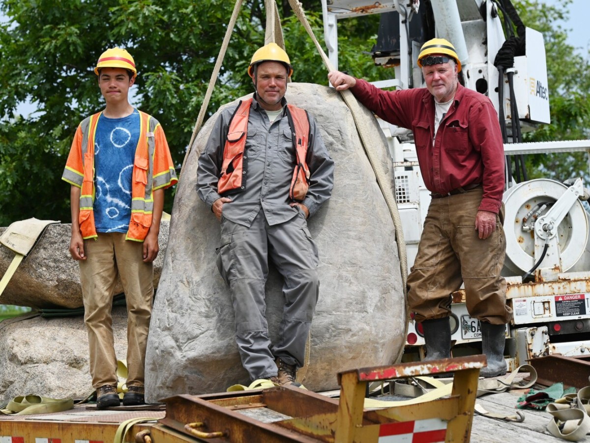 Jesse Salisbury was joined by his father and son Wednesday as they installed ‘Gathering Stones’ at Fish Point on Portland’s Eastern Prom Trail.