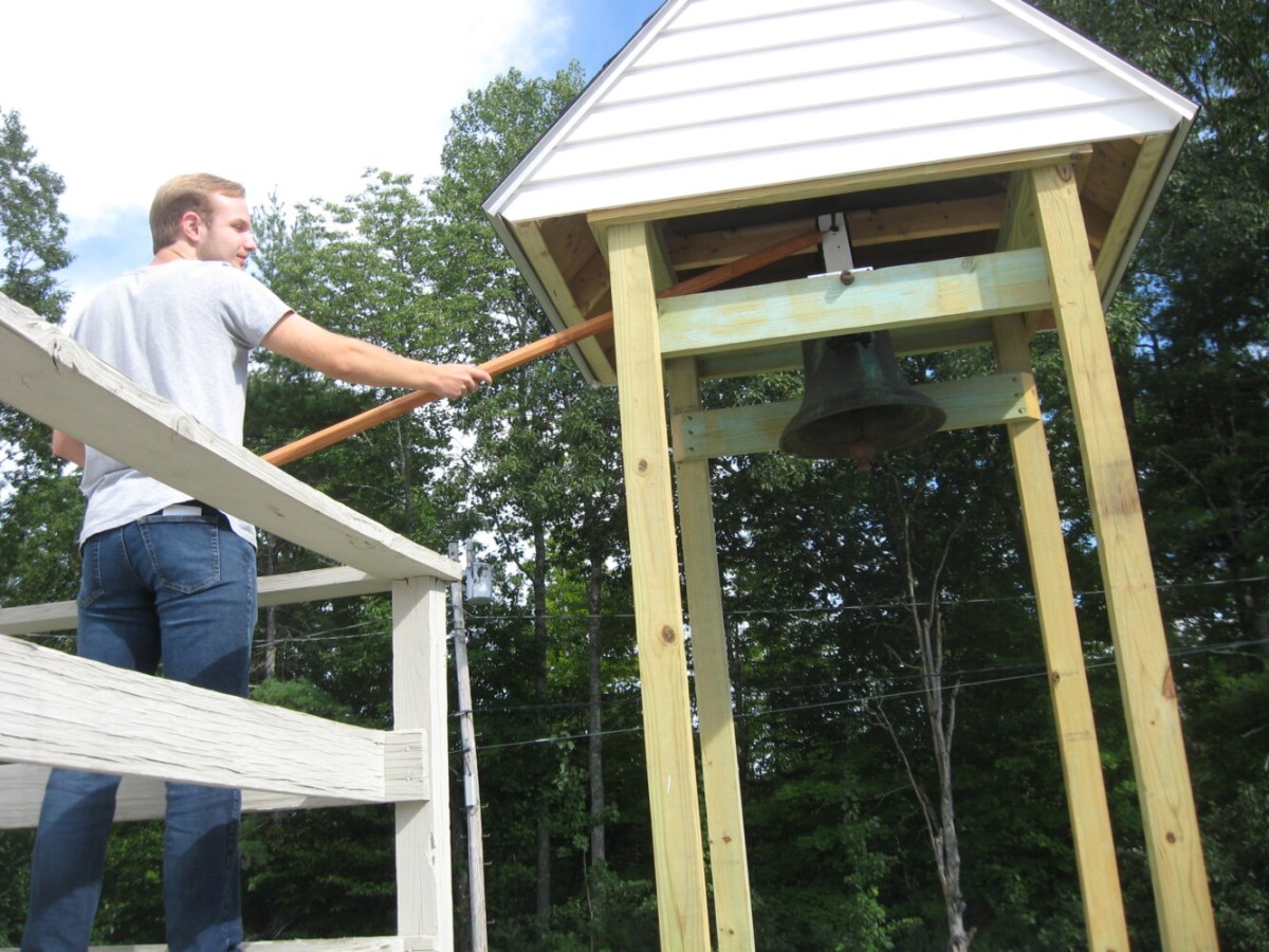 Boy Scout Ian Ruona builds a structure at a church in the Chicopee area of Buxton to display a historic school bell, whose origins are unclear.