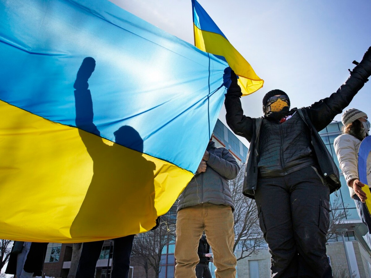 They stood in the cold along Forest Avenue on Saturday, holding signs and flags of yellow and blue and decrying the war underway in Eastern Europe.