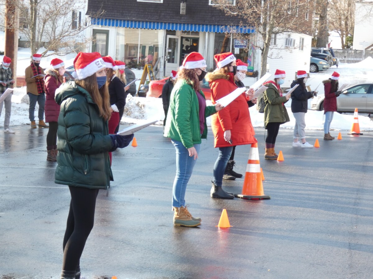 Nineteen senior chorus singers donned their masks and spread out in the People Plus parking lot in Brunswick to sing Christmas carols for seniors.