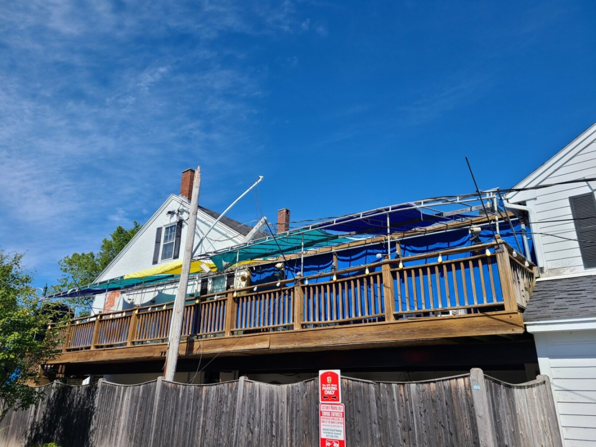 Police say no one was hurt before Central Maine Power Co., cut power to a live power line that landed on part of Joshua’s Restaurant and Tavern on Maine Street.