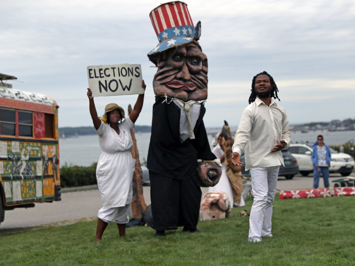 A crowd of close to 300 people gathered on Portland’s Eastern Promenade to watch a free, circus performance by Bread and Puppet Theater of Vermont
