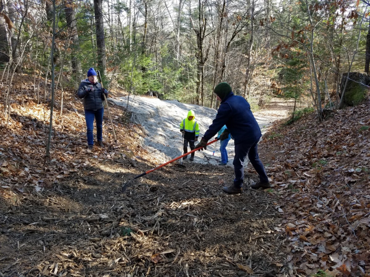 Volunteers from a local snowmobile club and the community at large pitched in to help a severely damaged trail on Scarborough Land Trust’s Fuller Farm Preserve.