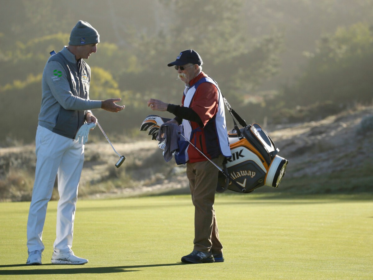 Jeff Willett and Mike “Fluff” Cowan, both Winslow natives, are caddying for Nick Taylor and Jim Furyk, respectively.