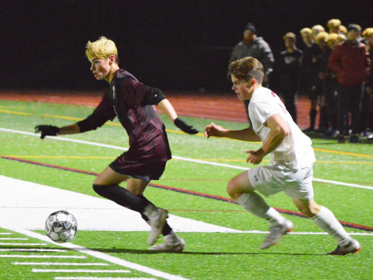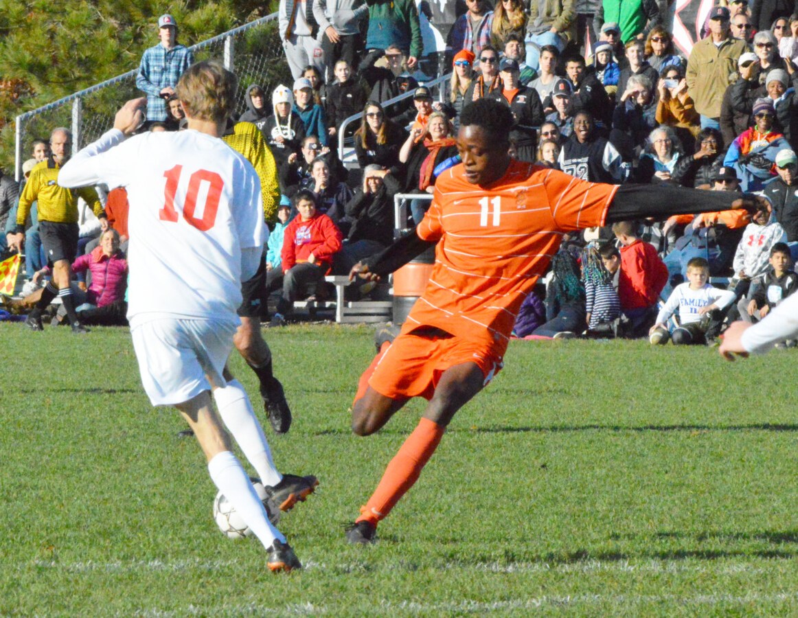 Josh Musica heads in the game-winner a minute into the second overtime to lift the Dragons to a 1-0 victory over Camden Hills.