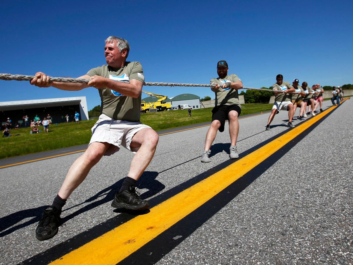 Teams of 25 people take turns trying to pull an 80-ton plane at the Portland International Jetport.