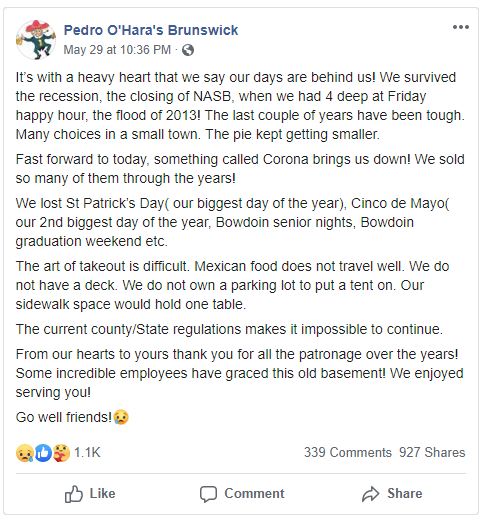 Pedro O’Hara’s in Brunswick shutters after 17 years as other downtown restaurants prepare to open patios
