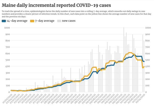 The one-day spike is higher than recent trends, with Maine’s seven-day average at 400 daily cases.