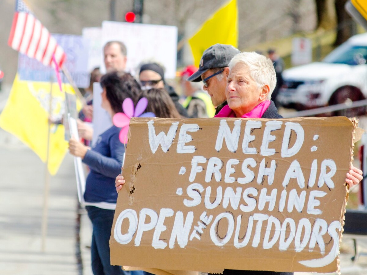 Approximately 70 people lined the streets, while others watched from parked cars and some vehicles circled the area, to protest executive orders signed by Gov. Janet Mills to keep people home and nonessential businesses closed.