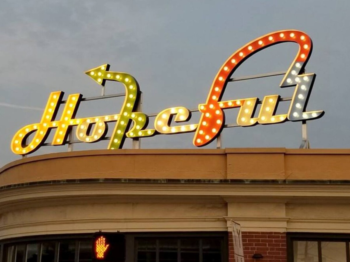 Charlie Hewitt, who who lives in Yarmouth, hung his first ‘Hopeful’ sign at Woodfords Corner in Portland last May.