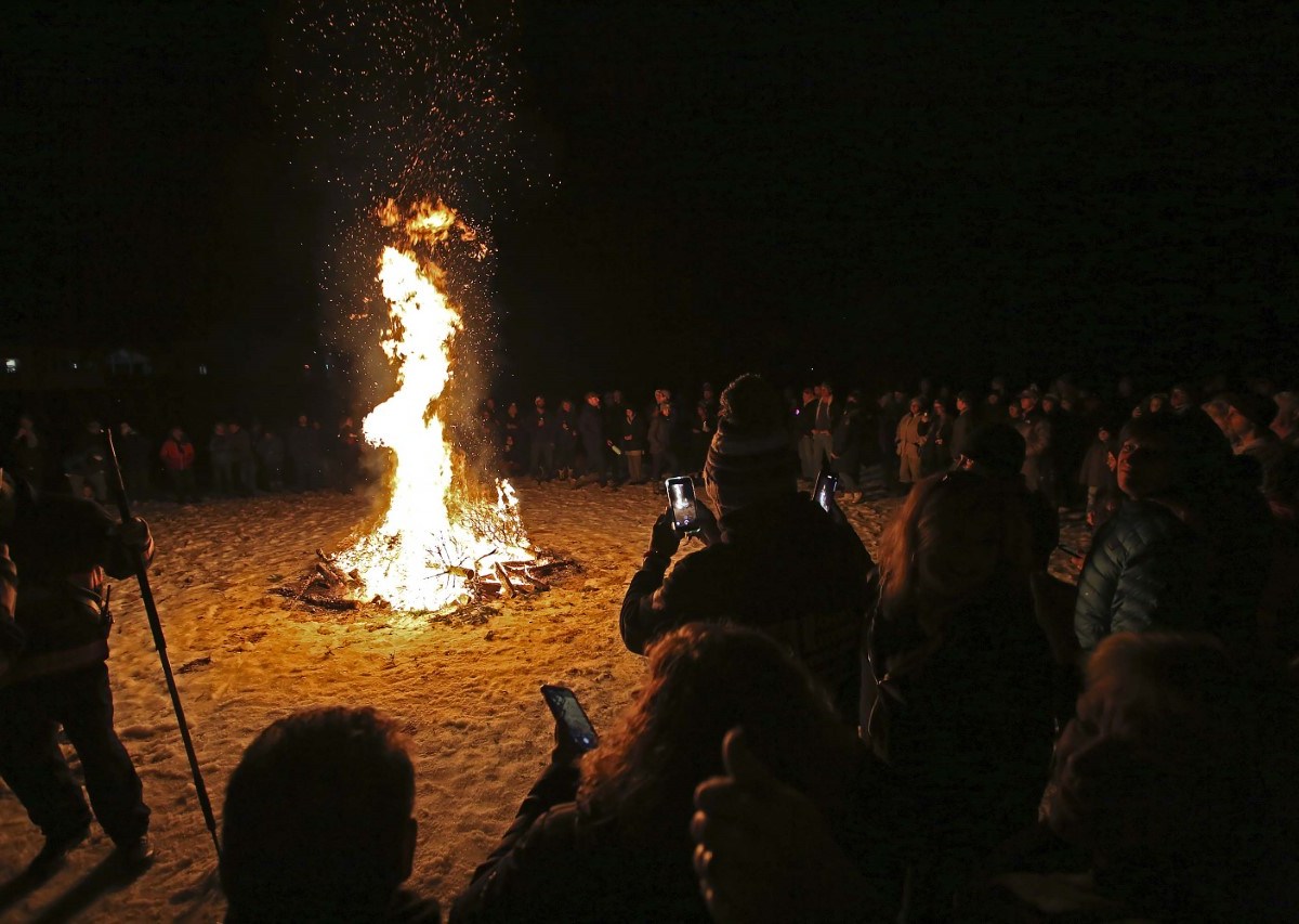About 2,000 people gathered for a bonfire and fireworks at Old Orchard Beach on New Year’s Eve to ring out a year fraught with uncertainty.