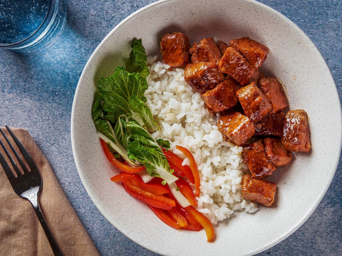 Sticky salmon with sushi rice and quick-pickled vegetables was inspired by Japanese teriyaki.
