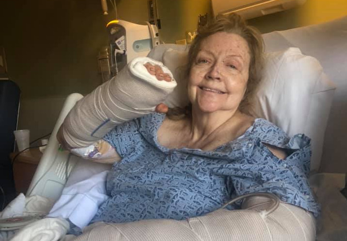 The victim of a vicious dog attack at her home last week, Constance Veilleux remains at Central Maine Medical Center where she will likely undergo further surgeries to repair damage to both arms suffered in the attack.