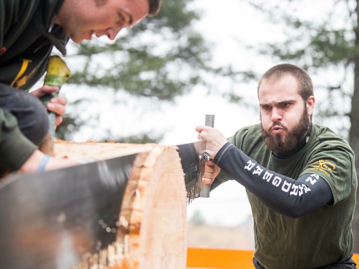 College students saw logs at Colby’s annual Woodsmen Mud Meet