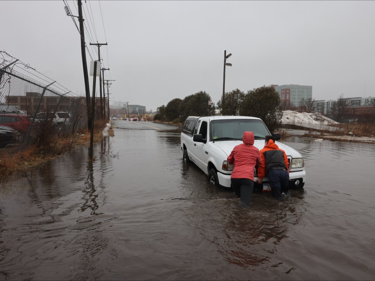 Around 2 inches of rain fell Saturday in southern Maine, flooding low-lying streets and businesses, while a record-breaking high tide inundated the already-soggy coast, eroded beaches and washed away two iconic fishing shacks.