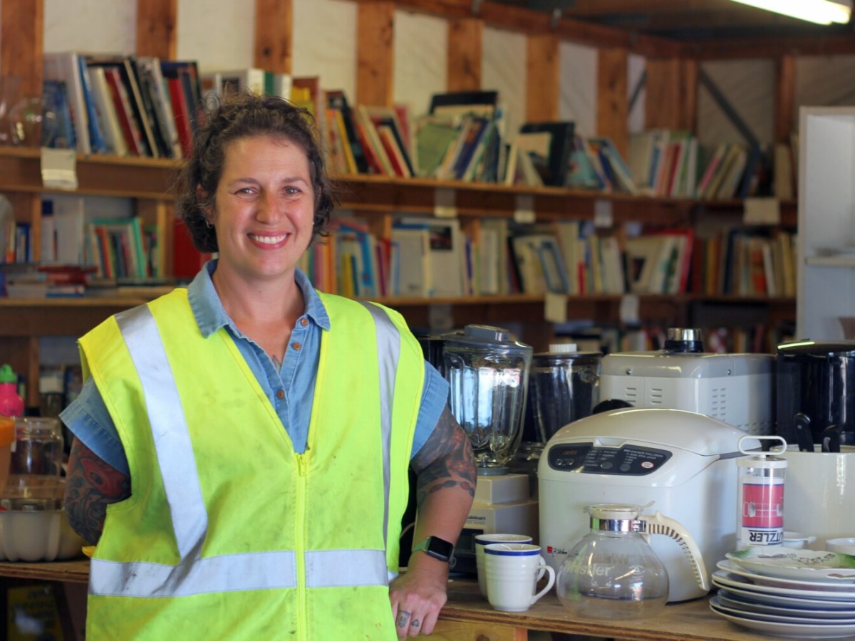 Volunteer Beth Cary curates donations at the town Swap Shop for people moving out of the Portland Expo.