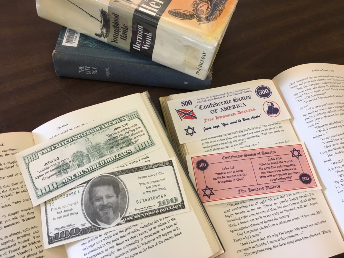 The bills, some under the guise of so-called Confederate dollars, have an evangelical Christian theme.