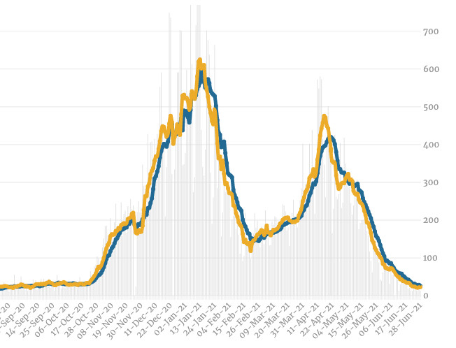 The seven- and 14-day averages are coming closer together, thanks to a long string of days with low infection rates.
