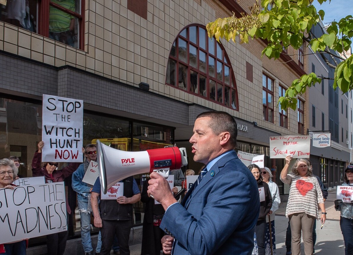 Mainers gather in front of U.S. Rep. Jared Golden’s office to pressure him on the looming impeachment battle in Washington.